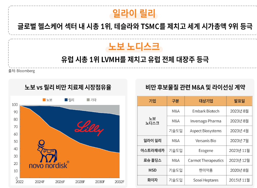 비만치료제 시장의 성장 가능성에 투자자들의 관심이 모아지는 가운데 TIGER 글로벌비만치료제TOP2 Plus ETF가 시의적절하게 출시되었습니다. 업계 선도 기업인 Eli Lilly와 Novo Nordisk에 집중 투자하면서 글로벌 빅파마 위주로 포트폴리오를 구성한 것이 특징인데요.