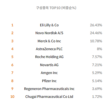 비만 치료제 업계의 강자인 Eli Lilly와 Novo Nordisk가 포트폴리오의 절반 이상을 차지하고 있는 가운데, Merck, AstraZeneca, Roche 등 글로벌 대형 제약사 종목들이 골고루 편입되어 있는 것이 특징입니다.