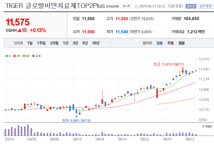 TIGER 글로벌비만치료제TOP2 Plus는 677억원 규모의 테마형 해외주식 ETF입니다. 1주당 가격은 52주 기준 최고 11,610원, 최저 9,970원을 기록 중입니다.