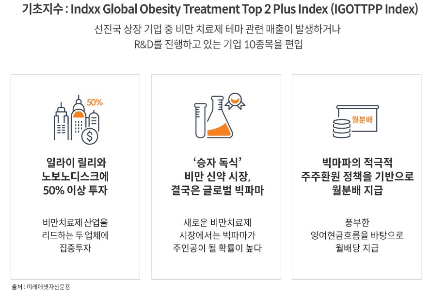 그러나 비만치료제라는 신성장 테마에 대한 시장의 뜨거운 관심을 고려하면 중장기적으로는 긍정적 흐름을 기대해 볼 만 합니다. 특히 업계를 주도하는 빅파마 종목 중심으로 포트폴리오를 구성하고 있어, 해당 기업들의 실적 개선이 수반될 경우 주가 상승 동력이 될 수 있을 것으로 보입니다.